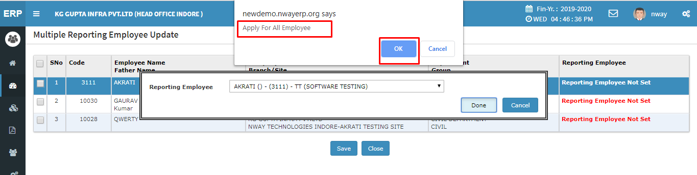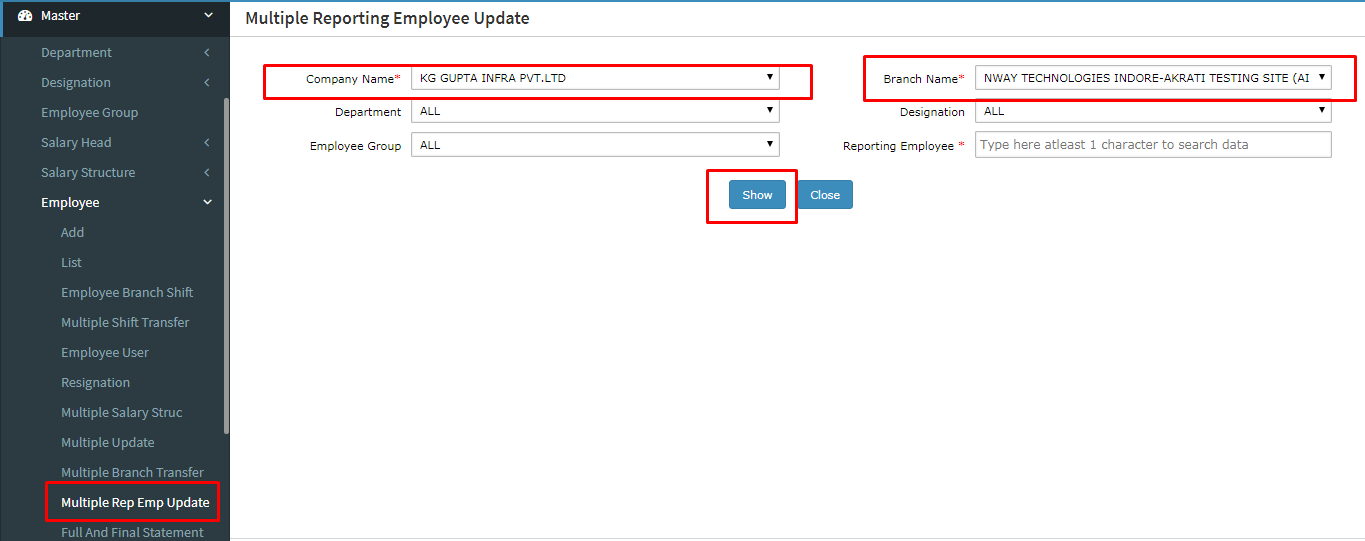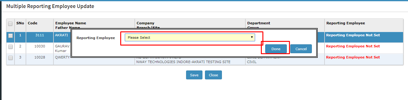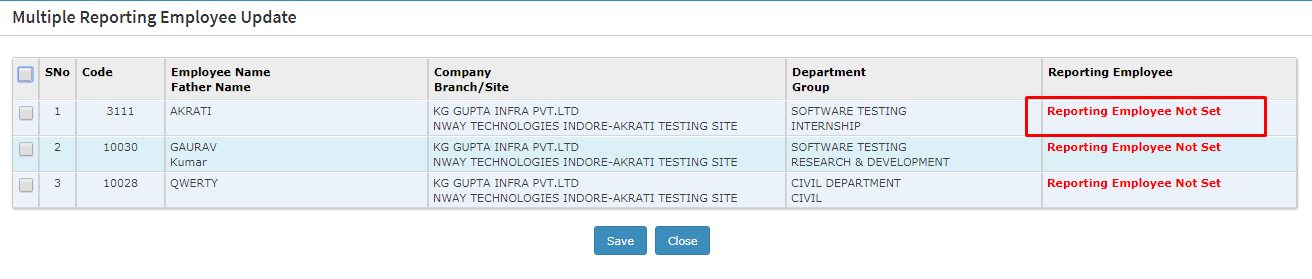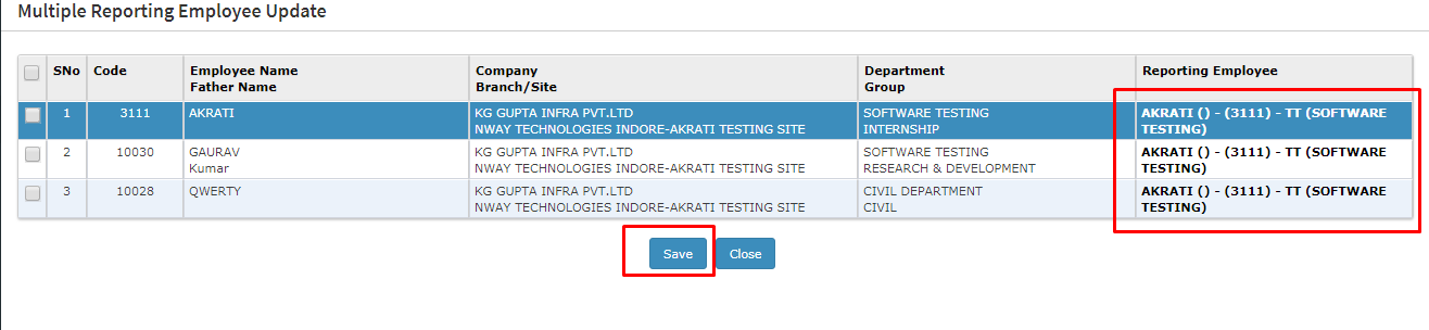 If you need to update reporting authorities of multiple employees at a time this can be done from the form named “Multiple Reporting Employee Update”